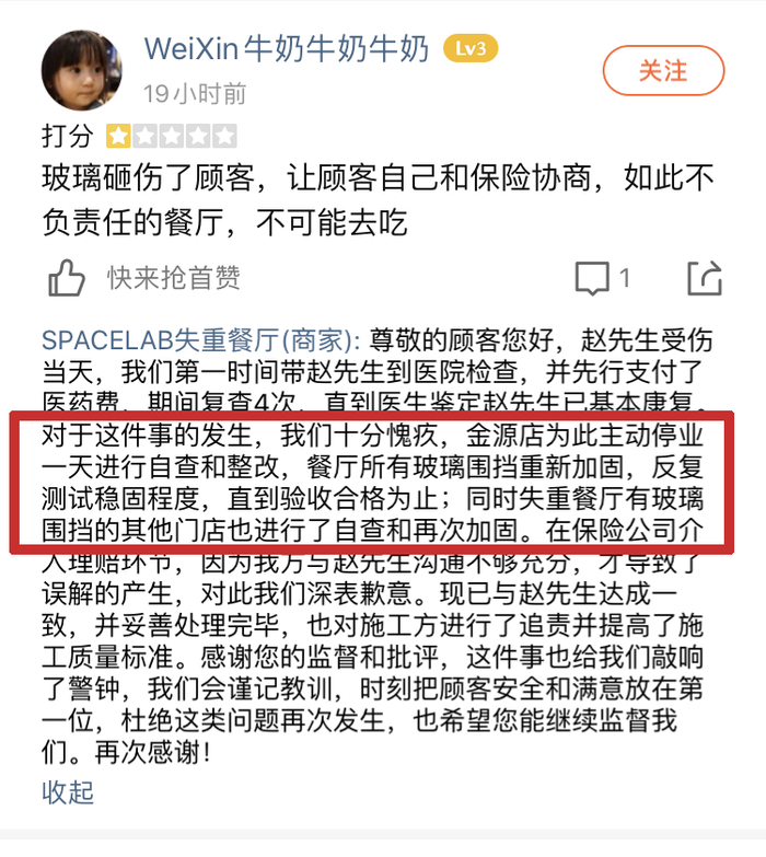 10月13日晚,失重餐厅世纪金源店的两扇玻璃突然倒地,砸伤了一名顾客,也险些伤到自家的员工。商家在大众点评上回应质疑时称:对于这件事的发生,我们十分愧疚,金源店为此主动停业一天进行自查和整改,餐厅所有玻璃围挡重新加固,反复测试稳固程度,直到验收合格为止;同时失重餐厅有玻璃围挡的其他门店也进行了自查和再次加固。