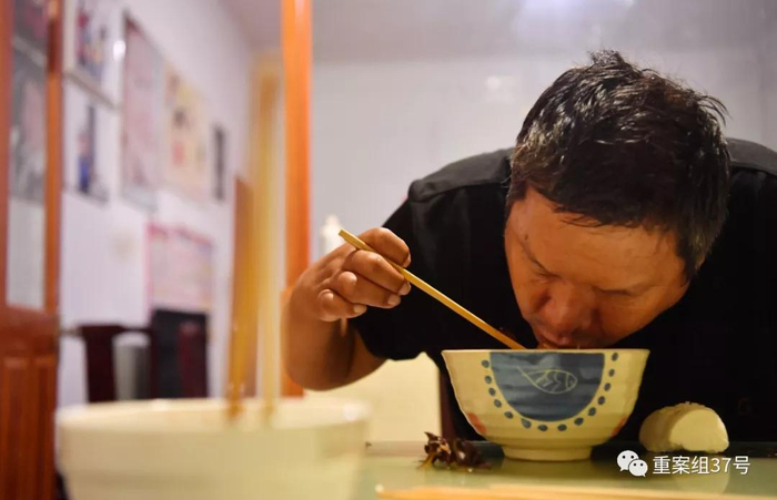 2019年8月16日晚,赵书新在训练用手指夹着筷子吃饭。新京报记者 李木易 摄