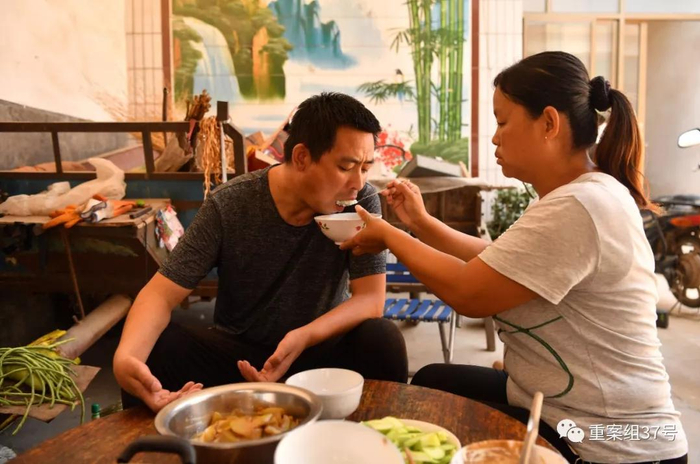 8月15日,河北平山县田兴村,妻子在喂曲新平午饭,曲新平的双手软软地摊在饭桌上。新京报记者 李木易 摄