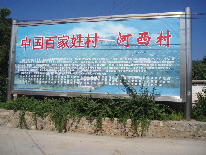 地处北京密云区古北口镇的河西村,位于潮河的西岸,河西村这个名字便由此而来。村子的三面被群山包围,山上是蜿蜒的长城,一个个烽火台昭示着村子的历史。在河西村口,竖立着一块大牌子,上面写着“中国百家姓村——河西村”,牌子上清晰记录了村里上百个不同姓氏。