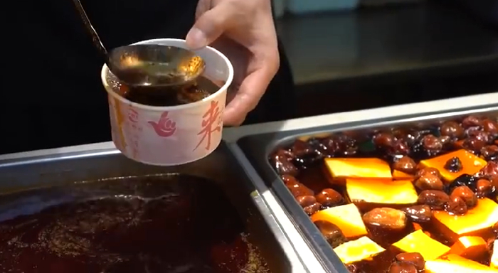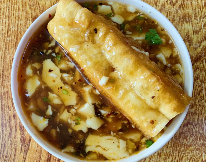 视频中提到,程先生在尝试了多次后发现,将鲜嫩的豆花加上爽滑的鸭血,简直“绝配”。再浇上新鲜香辣的红油,最后加上泡菜和香菜,酸辣可口。