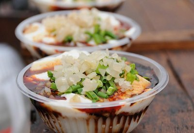 豆花里加上葱花、虾皮、紫菜,再淋上辣椒酱、酱油、蒜泥水……乳白色混合红色绿色,不怕颜色多,就怕味儿不够!