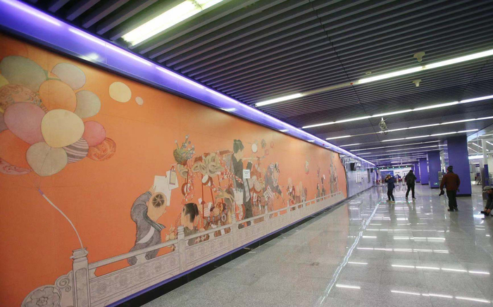 7号线东延段黄厂站内绘制有特色壁画。新京报记者 王贵彬 摄