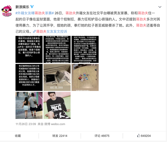 就在视频发布的前一天,韩国女星具荷拉身亡于公寓的消息扩散全网。人们在联想到韩国女星自杀现象之余,也联想到亲密关系中的暴力。生前,具荷拉曾被男友打到子宫内出血,却因为对方手握自己的隐私照片而不敢发声。在视频发布的第二天,蒋劲夫出狱后交往的新女友再爆其家暴行径,称与他交往的日子像住在监狱里。