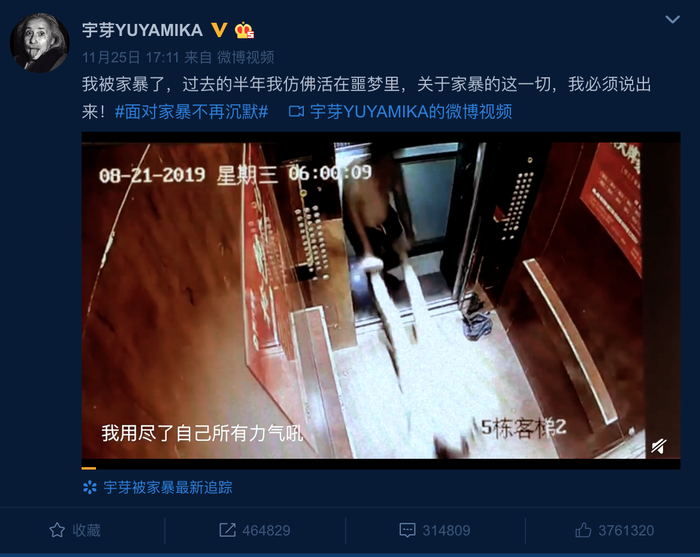 在中国,2019年的11月25日,则因为一条视频而变得不再寻常。仿妆博主宇芽发布视频揭发前男友@沱沱的风魔教 多次家暴,声泪俱下的控诉让嘈杂网络中的过客陷入了12分钟的灰色和沉寂。无论你打开视频是出于有意还是无意,是出于对议题的关心还是对热搜的好奇,都无法对那几秒钟的电梯监控视频保持淡定——究竟是一个怎样的人,会将自己的女友以如此残暴的方式拖出电梯。电梯关闭后显示的“欢迎业主回家”,巧合之下成为具有电影感的讽刺,而更令人瞠目结舌的是,那位被指控的施暴者,那位在社交媒体上营造热爱生活、喜爱小动物的艺术家人设的绘本作者,竟然在视频引发全网震怒之后,仍然跟宇芽视频中截取的录音一样毫无悔过之意,难道暴力对他而言,是一种标榜自我的“特立独行”?