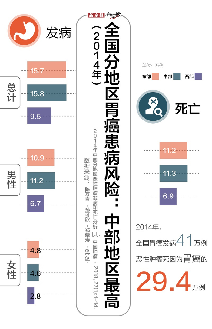 而在《2014年中国分地区恶性肿瘤发病和死亡分析》研究中,数据显示,2014年全国胃癌发病41万例,发病率、死亡率由高到低依次为中、东、西部地区。我国辽东半岛、山东半岛、长江三角洲、太行山脉和甘肃等地是胃癌高发区,中部地区胃癌发病、死亡率较高,这与胃癌高发区的分布有一定关系。