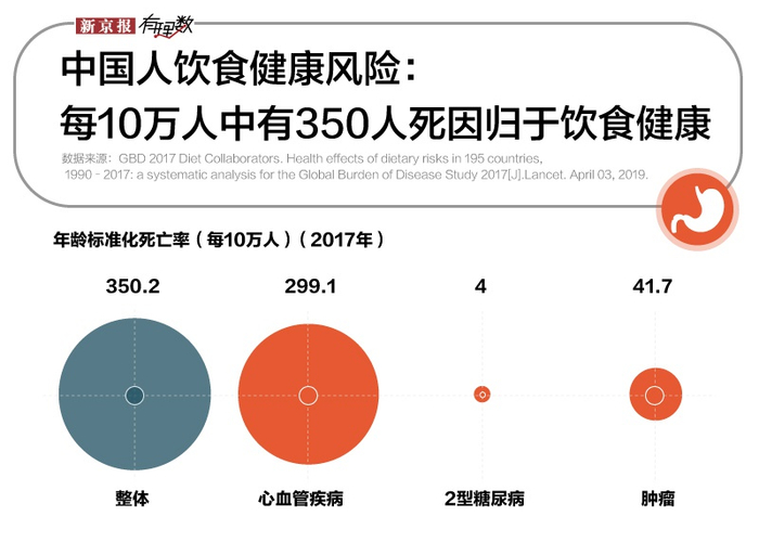 2017年,中国每10万人中就约有350人的死亡与不健康饮食有关,在全球195个国家和地区中排名第140位(排名越靠前,与不健康饮食相关死亡风险越低)。
