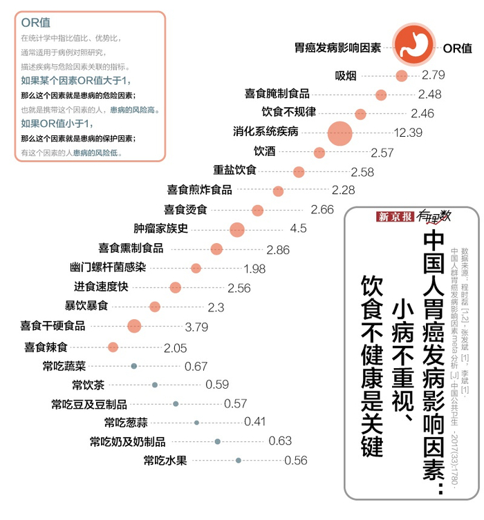 国内有研究收集了1998年1月-2015年12月公开发表的关于中国人群胃癌发病影响因素的相关研究,进行meta分析(一种用来收集和整合有关一个研究问题的所有相关研究证据的科学方法),最终纳入39篇中文文献,累计病例组患者8979例,对照组人群11593人分析结果。