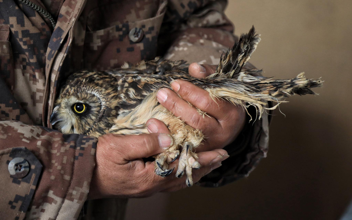 站长田志伟穿着一件略显陈旧的军大衣,在院子一角清点要放飞的小野鸟。“今天要先放飞三只东方白鹳,平日里它们在屋子里疗养,一下要自己去野外生活了,怕它们不适应,得先保护好眼睛。”田志伟边给一只东方白鹳戴“眼罩”边解释。