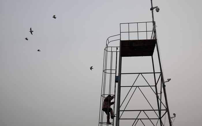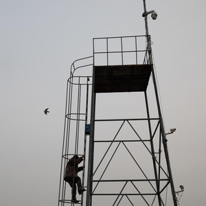 11月16日,唐山,田志伟爬上救助站的观察台,观察周边湿地鸟类情况。新京报记者 王嘉宁 摄