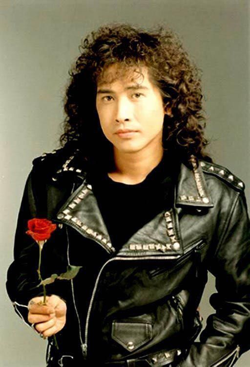 当年的齐秦,留着标志性的长卷发,穿着酷酷的皮衣。