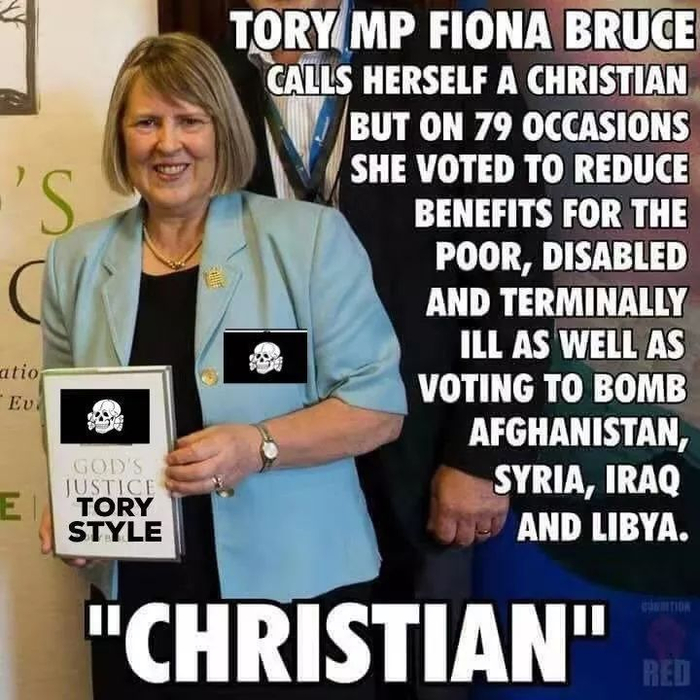 在社交媒体推特上,她所在选区的选民指责她:“菲奥纳·布鲁斯称自己是基督徒,但是她至少有79次在议会投票中支持减少福利,她支持轰炸阿富汗、叙利亚、伊拉克,还有利比亚 ”。