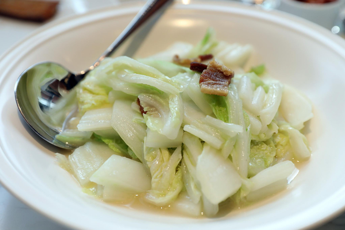 俗称“胶白”的胶州白菜,原产于胶州市胶城一带。“由于胶州所独有的土质和水源,具有任何地区大白菜所不具有的帮嫩薄、汤乳白、味甜鲜、纤维少,营养高”的特点,远在唐代即享盛誉,传入日本、朝鲜,称为“唐菜”。虽然这道菜端上来的时候,并没有什么惊艳的感觉,但吃进嘴里,同行几个人异口同声地说出了“甜”。即使是白菜帮的位置,都没有明显的纤维感。