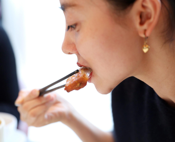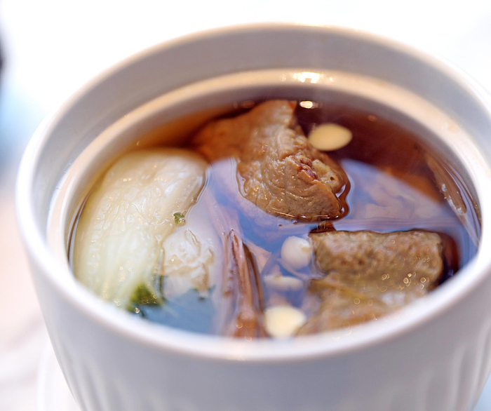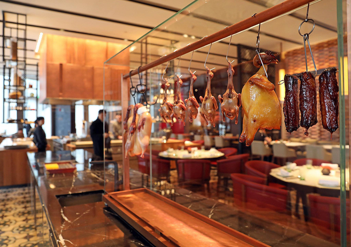 在新荣记新源南路店,空间挑高而开阔,开放式的厨房可以看到色泽油亮的烧鹅、脆皮鸡,可以看到例汤从热气腾腾的蒸笼中带着原盅、封着油纸端出来。