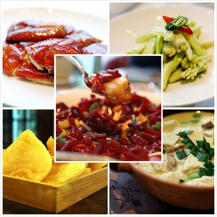 富贵脆皮鸡、泡椒花菜梗、辣烧水潺和农家盐卤豆腐煲等。