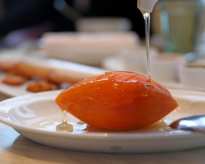 “蜜汁红薯”也是让北京冬天的街边烤红薯一下提升了档次。端上来后,服务员会将一整盅蜂蜜倾泻而下浇到红薯上面,红薯立刻变得溜光水滑,满是蜂蜜的光泽。但是吃完后,很多人还是很怀念烤红薯那种皮焦焦的、带着烤出的“流油”感,肉红红地冒着热气的原味香甜。加了蜂蜜,似乎有点甜过头。