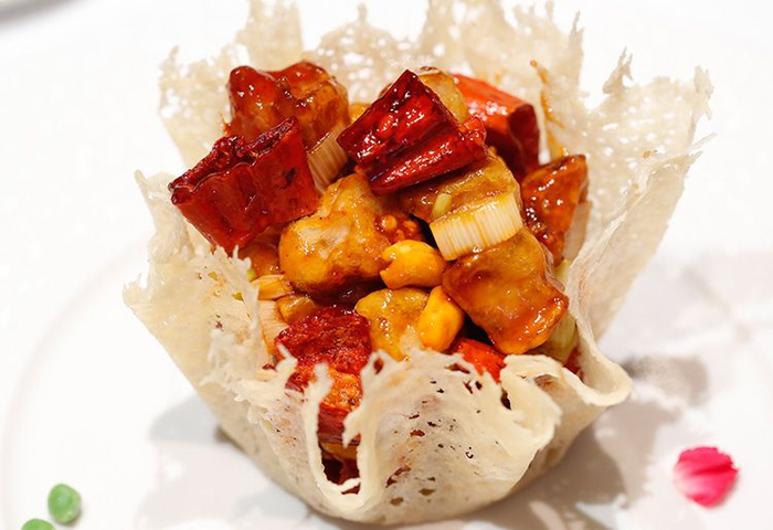 同样是吃素,京兆尹区别于很多素菜馆子“仿荤”的做法,体现“食材自然的味道”是其素菜的最大特色。少数的仿荤里面,保留了很有特色的糖醋莲藕:用莲藕、海藻、豆腐制作而成的素排骨,很有江浙糖醋小排的意味。宫保杏鲍菇采用传统而且很受欢迎的宫保做法,端上来就是酸甜微辣的香气四溢。外面用芝士炸制的“碗托”颜值很高,中西结合,为菜品增色不少。