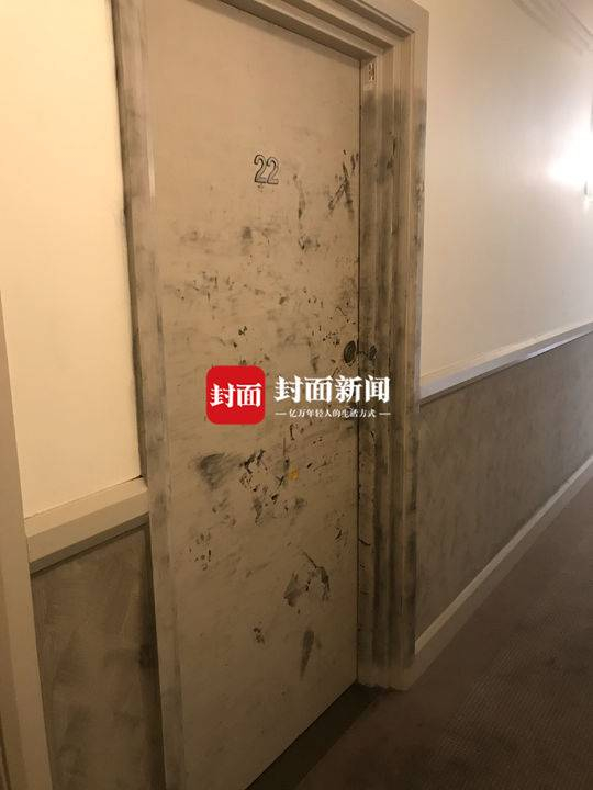 根据邻居指引,记者乘电梯来到案发的4楼的案发公寓。门牌显示22号的公寓大门,已经破乱不堪,损坏痕迹非常明显,应该是警方在进入公寓调查时撬门所致。而同一楼层隔壁的几家住户,都紧闭房门。