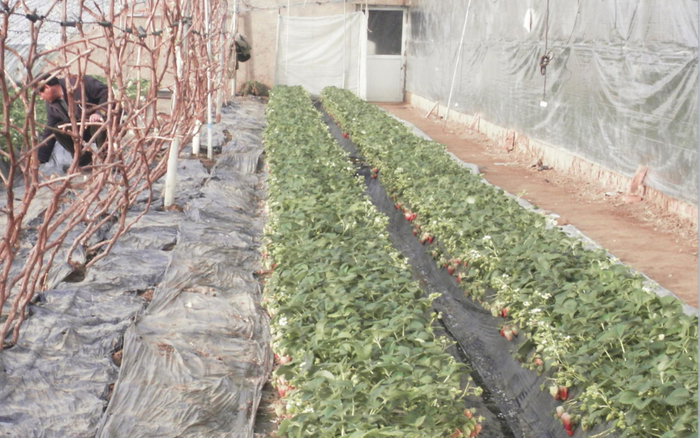 虽然大棚外冰天雪地,但棚里的草莓依然新鲜红艳,长势茂盛。每一垄草莓的上方,都是葡萄藤,葡萄还处于休眠期。据王女士介绍,草莓与葡萄立体套种,每个棚面积约为六分地,平均可以增加三千余元的收入。草莓8月栽种,次年4月底5月初结束采摘,这段时间正好是葡萄休眠期及萌芽、生长期;草莓栽种初期喜阴,栽种于葡萄树下更有利于存活和生长,而且在整个种植过程中肥料、薄膜、保温设施等都可以同步使用,大大节省了成本,“我们园区里原本也有大棚葡萄,后来就把草莓套种进去,效果很好。”