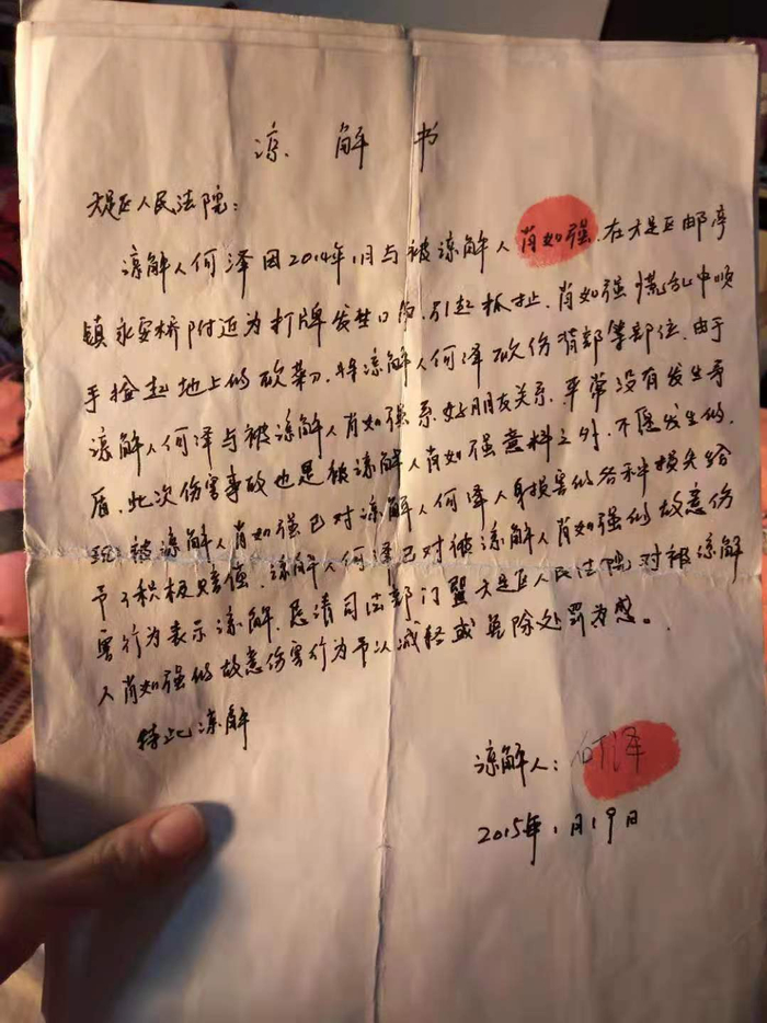 尹光德妻子陈世新提供的一份“谅解书”显示,2014年1月,何泽与肖如强在大足区邮亭镇永安桥附近打牌发生口角,引起抓扯,肖如强慌乱中捡起地上的砍菜刀,砍伤何泽背部等部位。