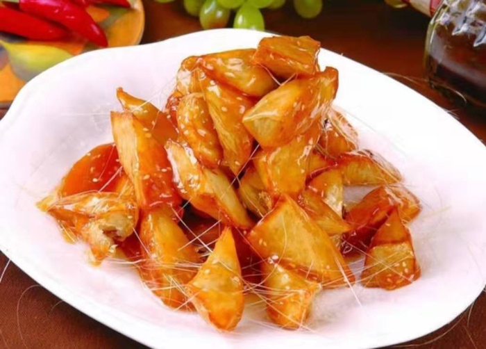 做法:将红薯去皮切成滚刀块放入油锅炸至浅黄色,捞出备用,然后将白砂糖放入锅中小火慢炒至黄色糖浆,将炸好的红薯倒入,翻炒裹糖后盛出装盘。