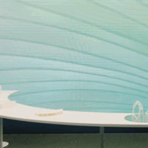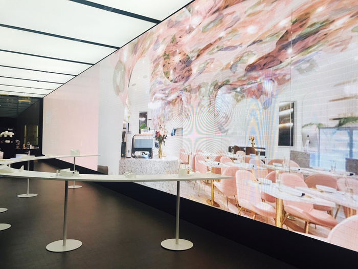 此外,在室内的半透明镜面上会“浮动”多媒体的图像。实际上,这是一面藏在镜面背后的“隐形”互动显示屏,将镜面墙化为可触控的“巨幕”。
