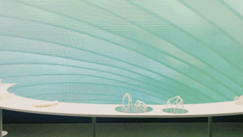 这场展览分为两部分,一层展示的是SODA已建成的项目,项目的图片在屏幕中滚动播放,用数字化的方式为观众带来沉浸式的体验。记者观察到,靠近屏幕的位置放置着一个半圆的环形平台,平台上陈列着一些空间项目的模型,而另外一个半圆的环形平台则是在屏幕中呈现,形成了虚拟与现实相呼应的效果,给人一种科幻与现实交织的感受。