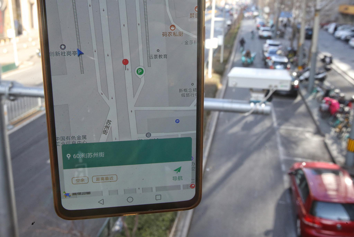 记者使用北京交通APP新增的“车位导航”功能在海淀区苏州街内找到空余车位。新京报记者 王贵彬 摄
