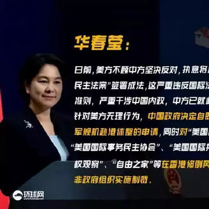 今天下午,外交部发言人华春莹宣布:日前,美方不顾中方坚决反对,执意将所谓“香港人权与民主法案”签署成法,这严重违反国际法和国际关系基本准则,严重干涉中国内政,中方已就此表明坚决态度。针对美方无理行为,中国政府决定自即日起暂停审批美军舰机赴港休整的申请,同时对“美国国家民主基金会”、“美国国际事务民主协会”、“美国国际共和研究所”、“人权观察”、“自由之家”等在香港修例风波中表现恶劣的非政府组织实施制裁。中方敦促美方纠正错误,停止任何插手香港事务、干涉中国内政的言行,中方将根据形势发展采取进一步必要行动,坚定捍卫香港稳定繁荣,坚定捍卫国家主权、安全、发展利益。