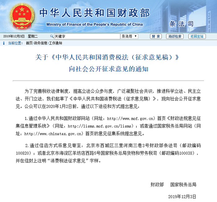 新京报快讯 据财政部12月3日消息,财政部、国家税务总局起草了《中华人民共和国消费税法(征求意见稿)》(以下简称《征求意见稿》),现面向社会公开征求意见。