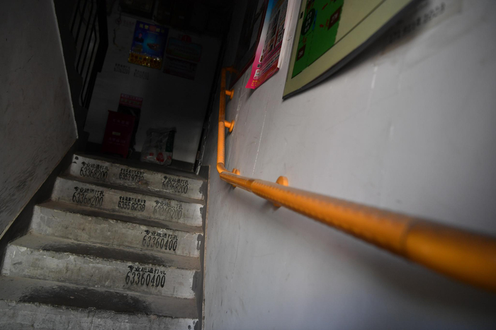 丰台区太平桥东里小区21号楼4单元内侧加装楼梯扶手。摄影/新京报记者 吴江