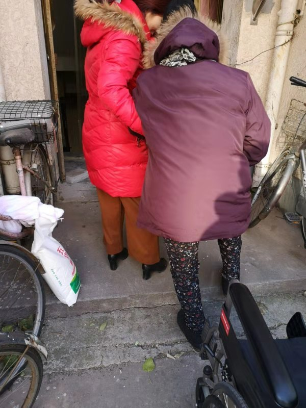 记者在该小区见到了多名乘坐轮椅的老人,他们都由另一人陪同出行。上午10点半,保姆张阿姨用轮椅推着80多岁的老人,在37号楼1单元门口的台阶前停了下来。张阿姨将刚买的菜放在一边,两手架着老人的胳肢窝将她扶起身,老人颤巍巍地站起来,扶着张阿姨迈上台阶,准备上楼。记者随后与张阿姨一同将老人扶到了二层家门口,家中83岁的张爷爷乘坐轮椅前来开门。将老人送至家中后,张阿姨又下楼把菜和大米拿进屋,最后再把轮椅搬上来,前前后后一共跑了3趟。当天最低气温达到零下4℃,张阿姨的额头上已经泛出细小的汗珠。