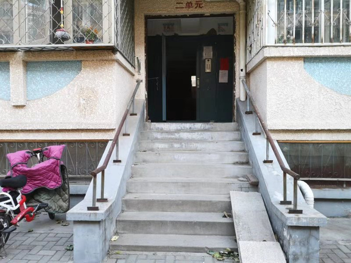 记者注意到,由于地势原因,太平桥东里小区17号楼外侧,7个单元的出入口外均有4-5个台阶,但未设置成无障碍坡道,部分安装了扶手。家住17号楼的王女士表示,虽然住在一楼,但由于平时总推小推车出门购物,上下楼梯不太方便,“如果能铺设一个缓坡会方便很多。”