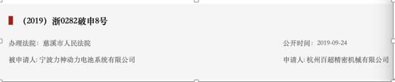 12月4日,新京报记者自全国法院重整信息平台获悉,宁波力神近期被申请破产清算,案号为(2019)浙0282破申8号,申请人为杭州百超精密机械有限公司,办理法院为慈溪市人民法院。