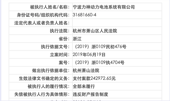 其中,宁波力神较近一次被法院列为失信被执行人为9月24日,案号为(2019)浙0282执4787号,做出执行依据单位为宁波慈溪法院,生效法律文书确定的义务为被告宁波力神于本判决生效之日起三日内支付原告报销款16605元。