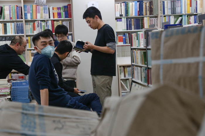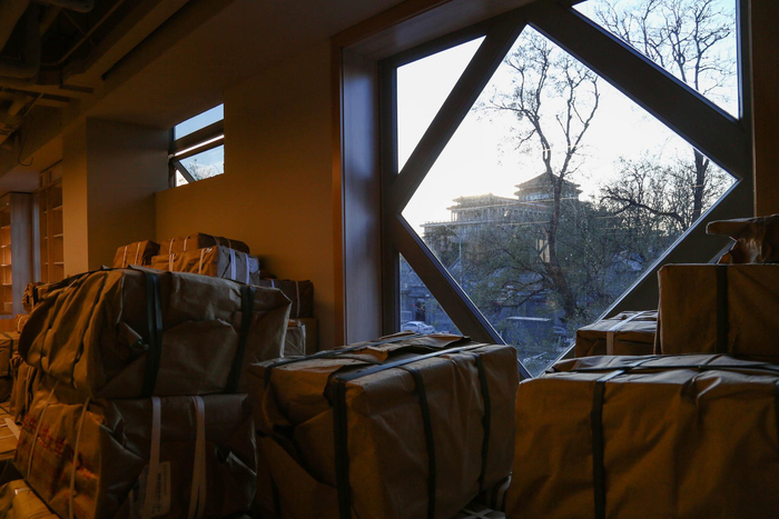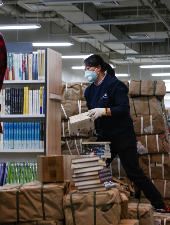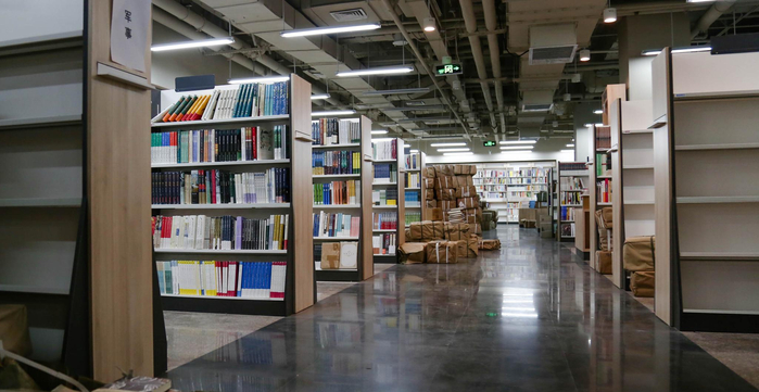 现在一楼正门还上着锁,玻璃窗被蓝色围挡遮住,看不到店内的情况。但来到书店的地下一层,这里非常热闹,二三十位工作人员正在热火朝天地往新书架上书。工作人员告诉京蜜,要上架的图书大约有7500包,三十余万册,这个月初刚刚开始上书,预计一周时间能完成所有的上书工作。