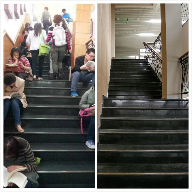 左图为装修前的阶梯,坐满了读书人(图/三联韬奋书店供图);右图为装修后,保持原貌的阶梯。