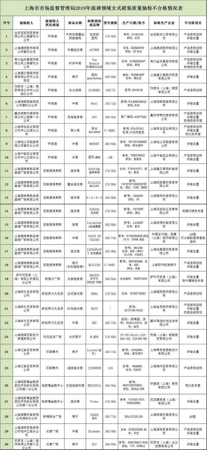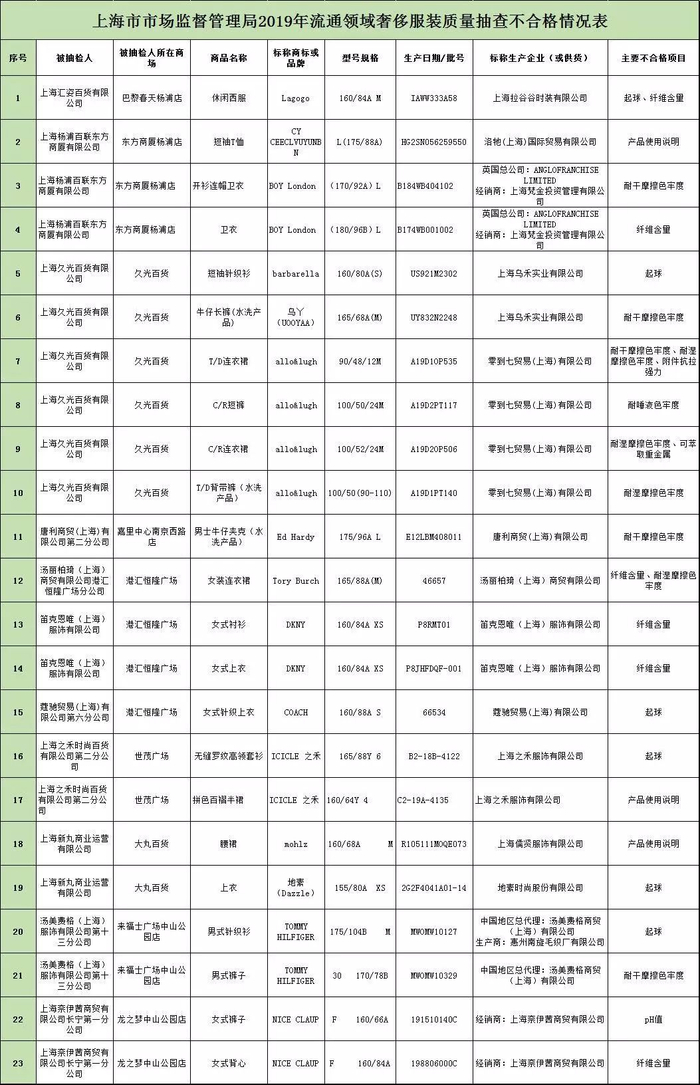 近日,上海市场监管局对上海市流通领域销售的255批次服装进行监督抽检,结果发现:125批次奢侈服装中,23批次不合格;60批次丝绸服装中,3批次不合格;70批次女式裙装中,30批次不合格,共有56批次服装质检不合格。不合格项目涉纤维含量、可萃取重金属、pH值、起毛起球等。
