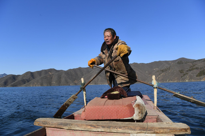 从家门口开到水库边上,要开几公里的山路,路边长着许多核桃树,“那是我的树,现在没空儿管它们”,万清河的父亲说。密云水库是北京的“大水盆”,环保措施很严,船是人力铁皮船,“零排放”。每年9月25日到次年3月,是水库的打鱼期,渔民必须持有捕鱼许可证,人证合一。全北京上千万人口,只有一百来张捕鱼许可证,而且“只减不增”,在“大水盆”里看到渔民劳作,正成为越来越稀罕的体验。