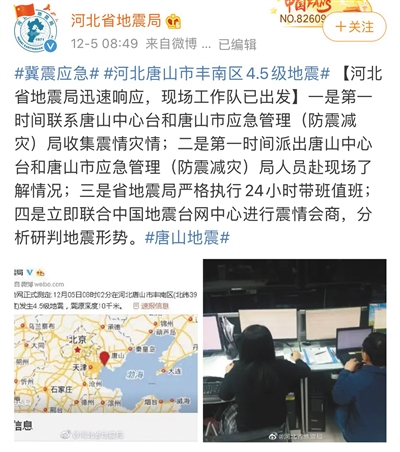 该微博称,从震级上看,这次唐山丰南发生的4.5级地震正好处于有感地震的分界点。据统计,一般震级在3级以上,地震开始有感。因此,将大于、等于3级,小于4.5级的称为有感地震。这种地震人们能够感觉到,但一般不会造成破坏。