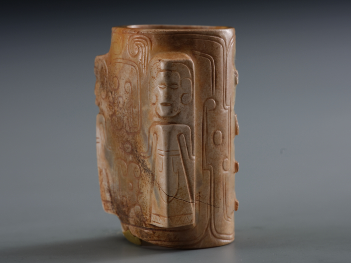刘家洼发现的一件玉琮与常见内圆外方琮有所不同,它仅一侧见方,两折角雕饰立人,其他部分雕刻抽象兽面和线条。这类琮以往仅见于齐家文化,但纹饰却为两周之际的特征,当是由齐家玉器改形而成。