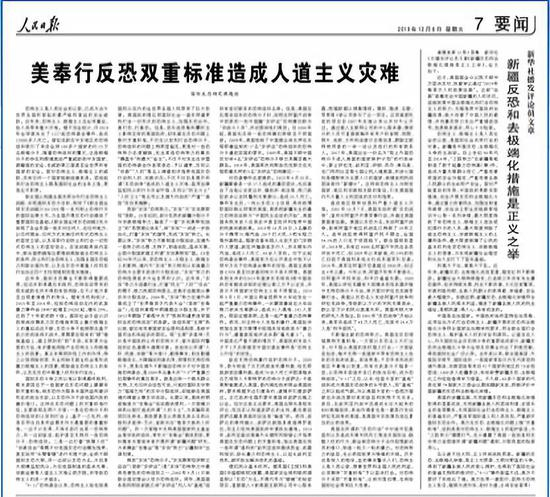 12月6日,《人民日报》大篇幅发表了一篇文章,名为《美奉行反恐双重标准造成人道主义灾难》。