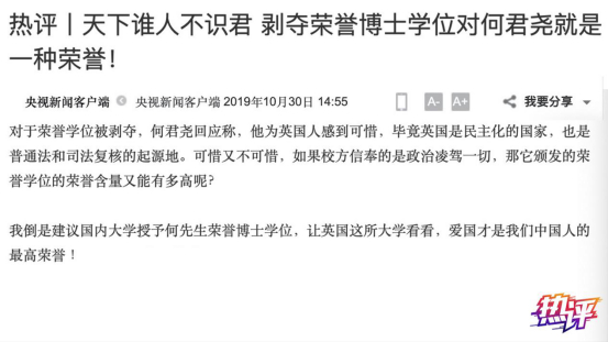也正因为此,央视新闻热评当时写道,“真要感谢一下这所英国大学,它的决定让人们清楚看到,它的荣誉标准真如鸿毛一样轻,它的程序公正真如纸一样脆弱。此时更想对何君尧先生说一句,天下谁人不识君?剥夺荣誉博士学位对你就是一种荣誉!”因为何先生被攻击,被剥夺荣誉博士学位,不是由于其他什么原因,而是因为他旗帜鲜明的爱港爱国言行。