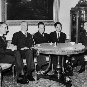 1957年,加缪获得诺贝尔文学奖。这是当年的六位诺奖得主中的五位在斯德哥尔摩合影:左起达特尼尔·博韦(Daniel Bou-vet ,生理或医学奖); 亚历山大·托德(Alexander Todd ,化学奖);加缪(文学奖); 杨振宁和李政道 (物理学奖)。当年杨振宁35岁,李政道31岁,都是诺奖得主中最年轻的一批人。