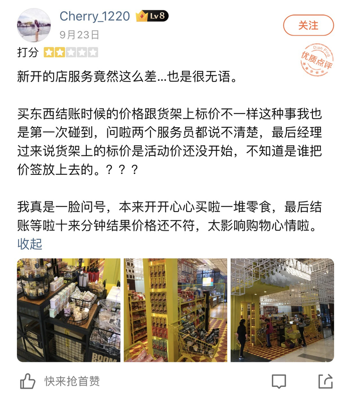 虽然店员态度诚恳,但是将产地不同,价格不同的同名产品放在一起,容易对顾客造成误导。包括有顾客在大众点评中表示,在本宫零食创研社“买东西结账的时候价格跟货架上标价不一样”等因店员疏忽导致的问题,影响了顾客的消费体验。