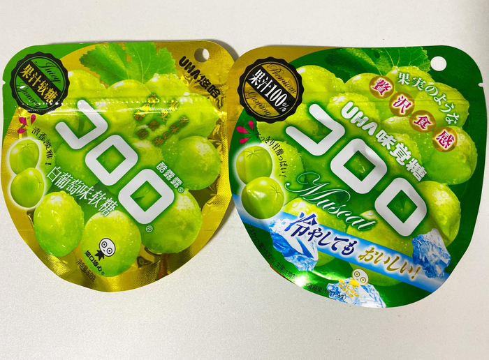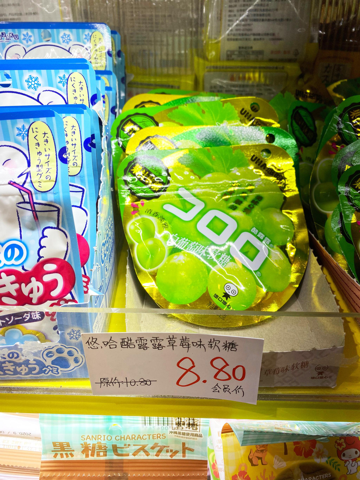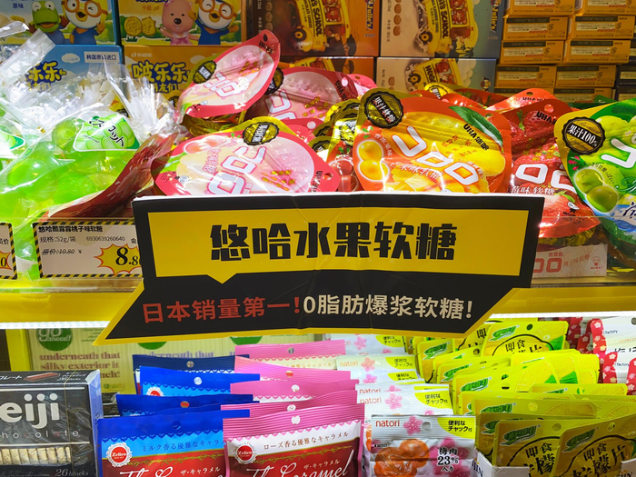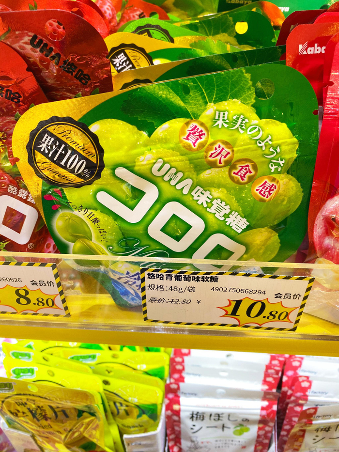 为什么这款糖果的生产商在上海,而店家却在这款糖果旁的宣传板上写上“日本销量第一”?难道是出口转内销?正当京蜜百思不得其解之时,货架上的另一款商品,让京蜜内心的困惑变得逐渐明朗起来,这款商品是由日本的味觉糖株式会社生产的悠哈软糖,包装上全部是日文。原来所谓“日本销量第一”的糖其实是这款售价10.8元的日本进口的悠哈软糖,而非悠哈味觉糖(上海)有限公司生产的售价8.8元的国产悠哈水果软糖。