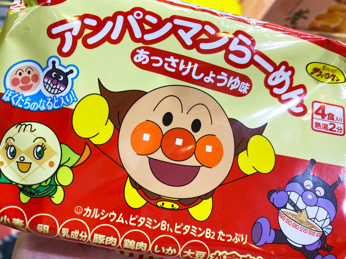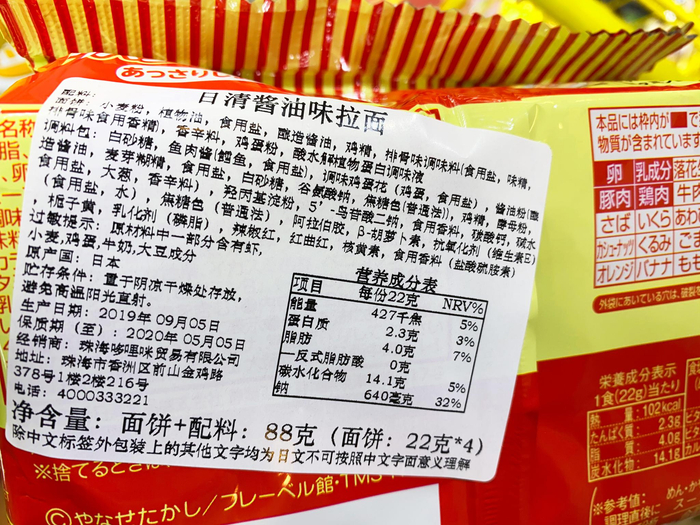 在另外一个货架上,店家重点推荐一款售价29.8元一袋的日清面包超人儿童泡面,卖点是“0添加0防腐剂的宝宝泡面”。但是在包装袋后的中文配料表中,标明有乌苷酸二钠、焦糖色、阿拉伯胶、抗氧化剂、乳化剂及食用香料等多种食品添加剂,与宣传牌中所标示的“0添加”自相矛盾。