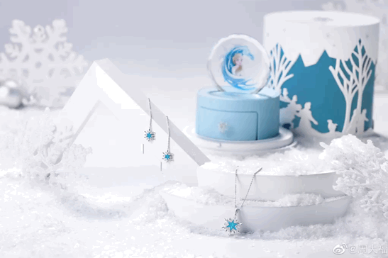 周大福“冰雪奇缘2”铂金新品首饰系列包括耳线、耳钉、项链及手链等多个款式,以《冰雪奇缘2》经典雪花造型为设计元素,在材质与工艺上采用了铂金材质打造,搭配渐变帕拉伊巴碧玺蓝珐琅工艺,耐磨且不易褪色。此外,周大福“冰雪奇缘2”系列的配套首饰盒也很讲究,集首饰盒、小夜灯、装饰品三位一体,巧妙细致、实用美观。