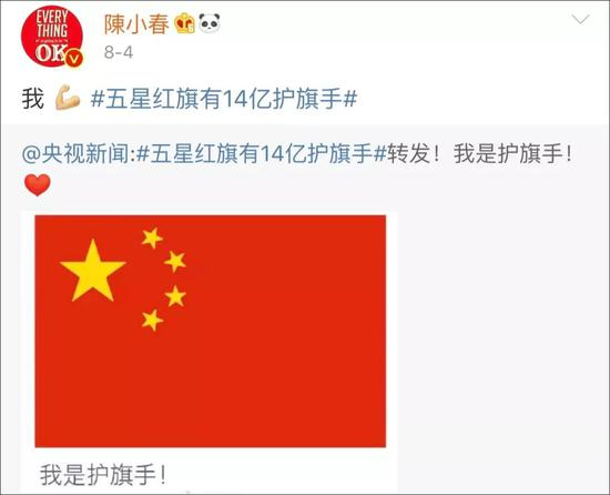 而值得注意的是,今年8月,香港暴徒侮辱国旗一事引发香港市民以及内地民众的强烈愤慨。当时,新浪微博话题#五星红旗拥有14亿护旗手#登顶热搜榜,陈小春也发声力挺。↓