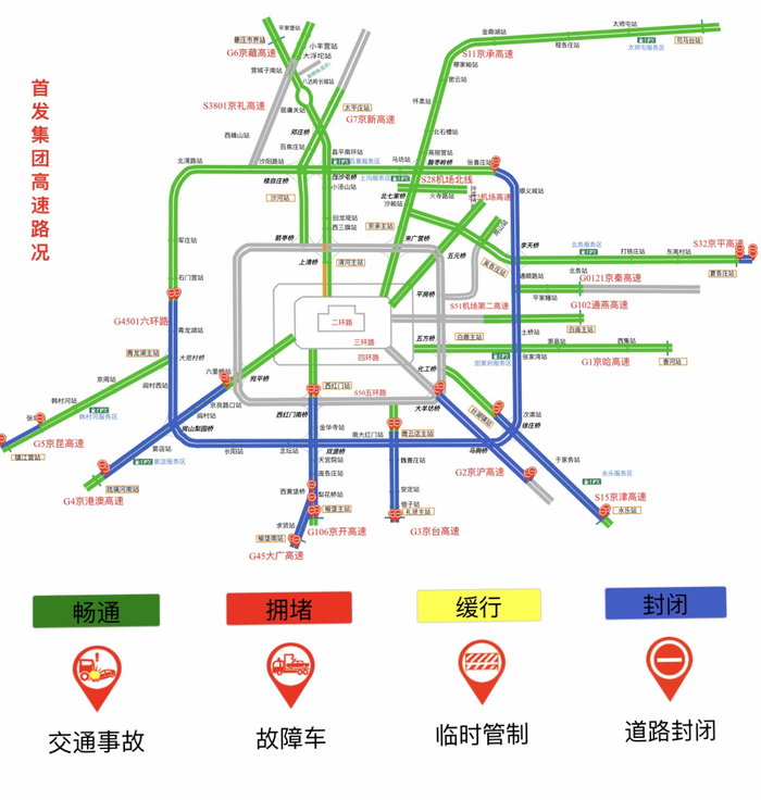 北京:京开高速出京方向西红门主站至市界、进京方向市界至西红门南桥路段;大广(京开)高速双向黄垡桥至市界路段;京台高速双向青云店至市界路段;京港澳高速双向杜家坎主站至市界路段;京津高速双向台湖主站至市界路段;首都地区环线高速公路双向北京段全线;京平高速双向南太务至市界路段,出京车辆由南太务出口驶出;京沪高速双向北京段全线;六环路双向六元桥至千灵山路段;六环路双向太和至千灵山路段;六环路双向长阳至千灵山路段。